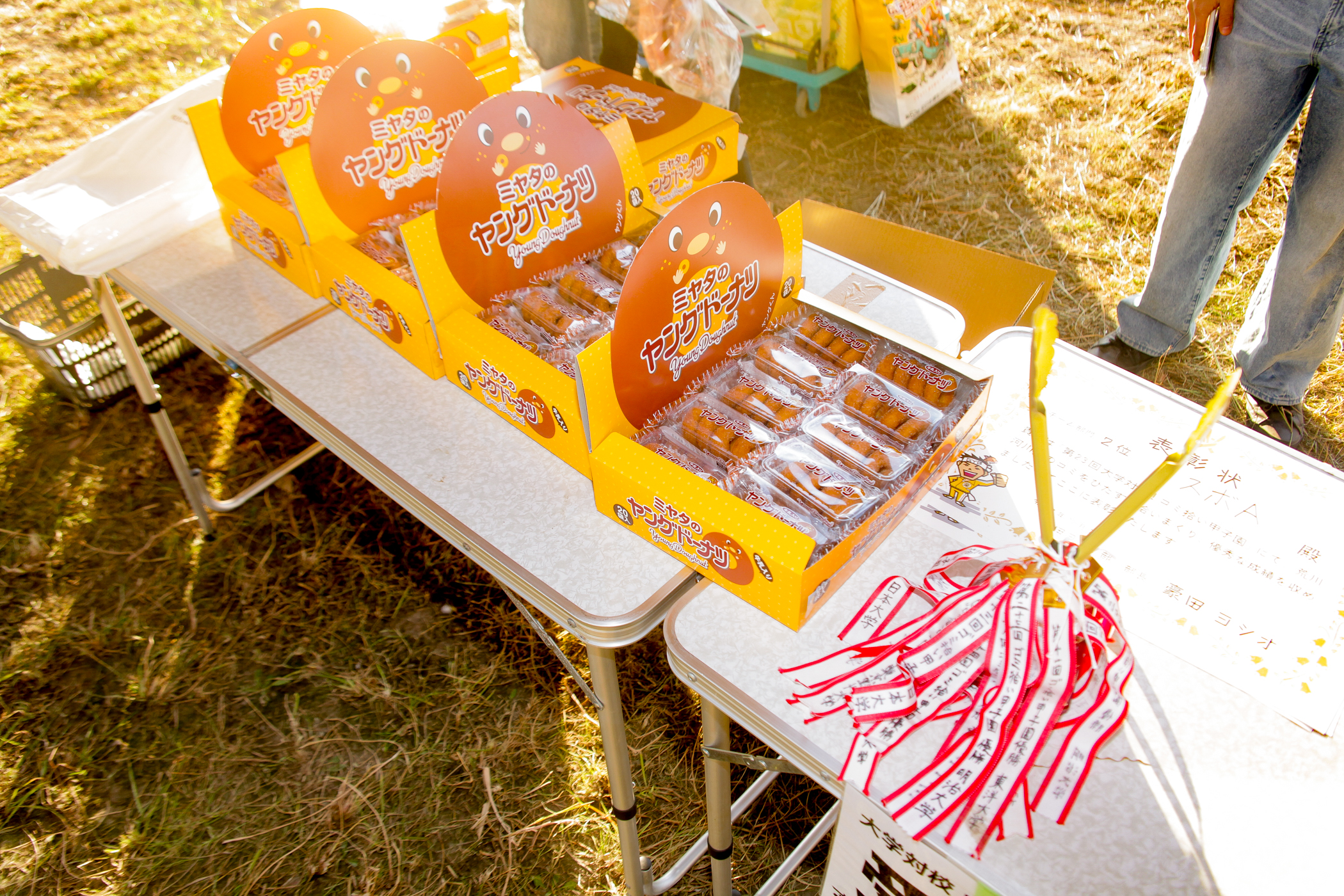▲参加賞のヤングドーナツと金のトングトロフィー